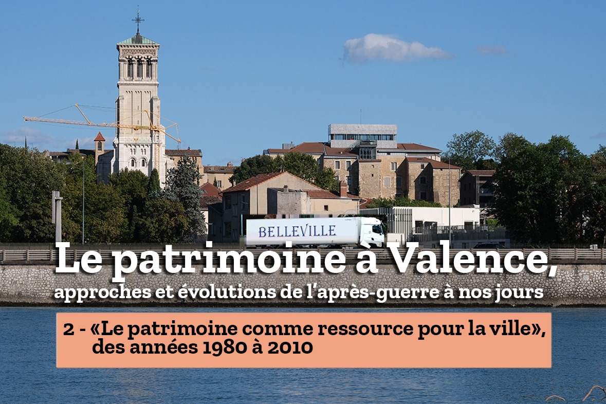 A la suite de la synthèse de l’après-guerre aux années 1970, ce second article s’attache aux années 1980 à 2010 marquées par une attention particulière au patrimoine, héritage de l’histoire de la cité, à la fois au niveau national et à l’échelle de Valence. « Le patrimoine comme ressource de la ville » (*) devient un véritable levier de développement urbain et culturel. Ainsi Valence s’inscrit dans cet élan dès les années 1980 et met en œuvre une démarche de valorisation du patrimoine et de démocratisation culturelle favorisant la revitalisation de la ville et notamment du centre ancien.
