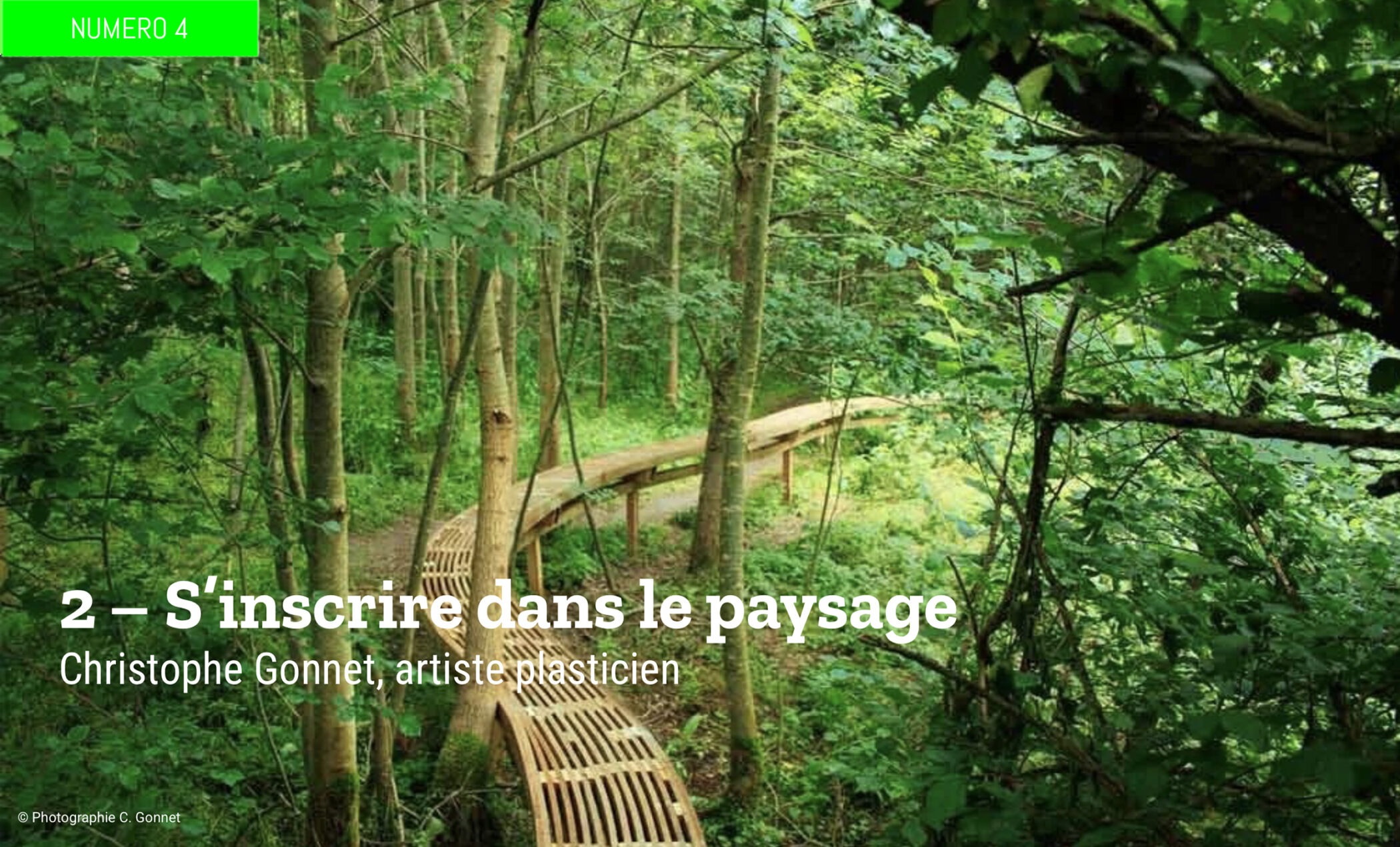 Les œuvres in situ de Christophe Gonnet s’inscrivent respectueusement dans le paysage sans rechercher de rapport de domination ; il s’agit pour lui de s’immerger dans un milieu, de s’ouvrir à la contemplation de ce qui l’entoure, d’en apprécier la singularité : l’intimité d’un sous-bois, la densité d’une forêt, l’humidité d’un sol marécageux… Des passerelles, des entourages, des cheminements, des poses… sont imaginés et fabriqués par l’artiste qui intervient seul ou en collaboration avec d’autres – paysagistes, architectes, etc. – dans de nombreux sites au sein de résidences, de commandes publiques ou privées, notamment dans le cadre du projet des « Routes sublimes du Vercors ». Dans ce second article, Christophe Gonnet aborde plus particulièrement les processus de création et de production, le statut de l’œuvre d’art et de l’artiste.