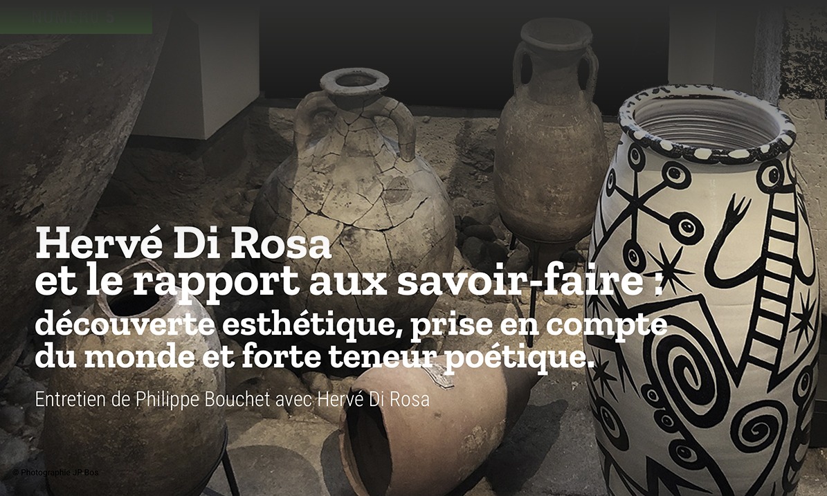 Nourri par l’univers du quotidien, de la bande dessinée à la musique rock, Hervé Di Rosa investit le musée de Valence (*) avec 200 œuvres qui dialoguent avec les collections permanentes historiques et contemporaines. Ses peintures sont surtout connues et associées à la Figuration libre, cependant cet artiste revendiquant plutôt les arts modestes a développé une pratique plurielle – moins connue – mêlant arts graphiques, céramique, vannerie… continuellement enrichie au contact d’artisans du monde entier. Philippe Bouchet, commissaire de l’exposition « Hervé Di Rosa. Ses sources, ses démons – ALL-OVER » (*), s’entretient ici avec l’artiste sur sa démarche avec les artisans d’ailleurs, sur la création collective et sur les relations savoir/savoir-faire.