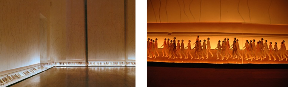 CN – L’impasse d’Orphée (ill. 12, 13), présentée au Musée d’Art et d’Archéologie de Valence en 2008 a été une installation importante, pensée à partir de l’obligation d’occulter la porte de la salle qui suivait l’installation d’Alain Fournier. La légende d’Orphée, mosaïque conservée au musée, a été une source d’inspiration pour l’exposition PERMUTATIONS. Peint sur des plaques de plexiglas posées au sol, un même personnage se répète le long des 4 murs conduisant à une « impasse ». La perception dans la pénombre des ombres dessinées sur les murs et la présence de ce personnage multiplié, marchant au-dessus du sol et rendu transparent par l’éclairage au sol, crée une atmosphère singulière. Les éléments dessin et peinture qui sont les attributs de l’artiste sont près de disparaitre …