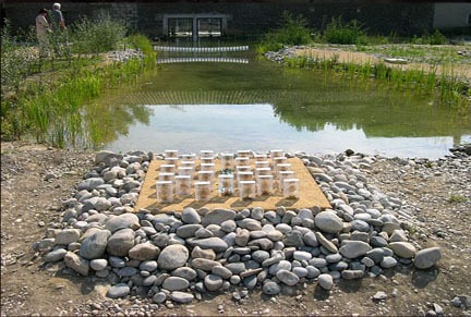 Les Nymphes (ill. 14, 15) à la Maison des Ramières à Allex pour « la Drôme rivière sauvage » avec la contrainte d’être à l’extérieur. La mare près de la Maison des Ramières a été l’endroit favorable pour me conformer au thème commun et à ma démarche. Comme l’écrit Jean Markale, « la croyance aux ondines qui hantent un monde mystérieux et tentent d’y attirer les humains qui leur plaisent, est répandue dans les contes oraux de tous les pays ». 30 boites en plexiglas remplies d’eau teintée des couleurs avoisinants la mare, 30 autres boites garnies de fleurs de carottes sauvages installées sur des galets de la rivière Drôme.