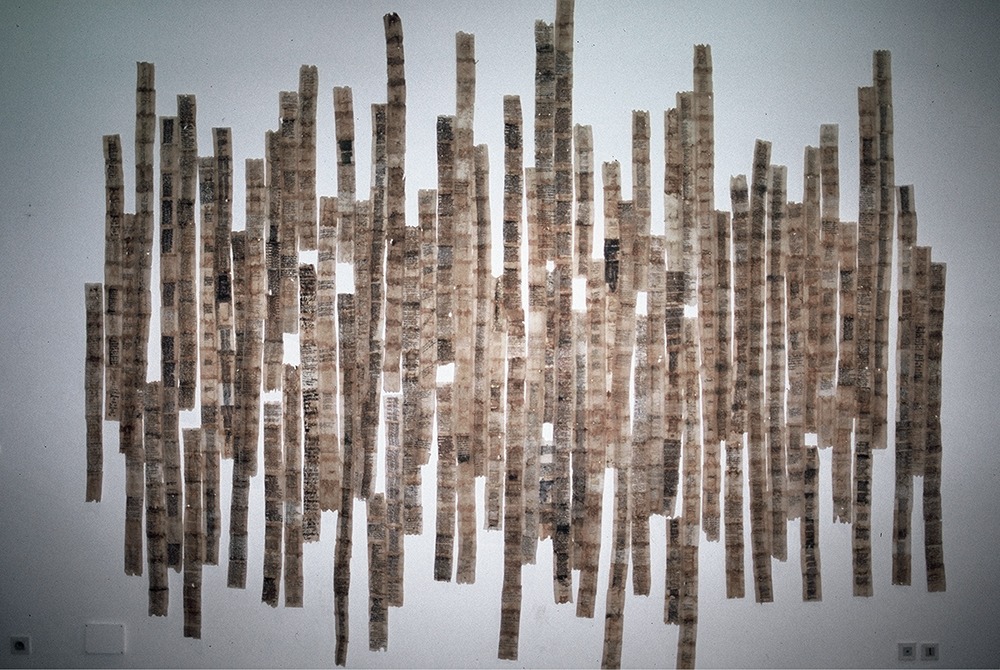 MF – L’écriture, la citation ont souvent été présentes. C’est un dessin de traces qui correspond à une sonorité proche d’une musique sans instrument. C’est une couleur de plus, un coup de pinceau de plus. L’écriture est là comme un point final, elle peut être écrite par terre, être indépendante de la peinture ; ou être un graphisme qui bouge par le déplacement d’air au passage des visiteurs comme dans l’installation Testaments (ill. 16).