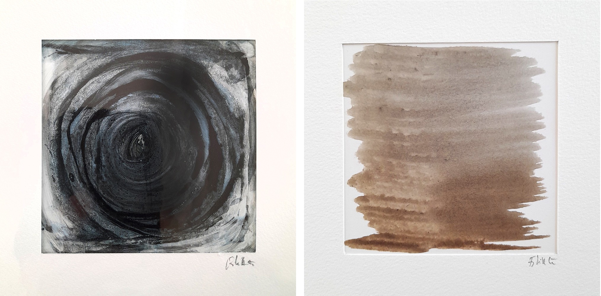 Après un travail in situ qui m’avait permis de m’affranchir des contraintes de la peinture, de quitter l’espace réduit de la toile, et les différents mouvements de peinture, comme Support Surface, qui me confortaient dans une autre manière de montrer : « j’ai eu besoin d’un retour à la vraie peinture et à la condition de cette indispensable économie de moyens. Le mélange des matériaux divers et « non faits pour » a pour moi passé son temps ; revenir à l’idée de tableau » (*). Revenir à une peinture « enfermée » est un vrai paradoxe !! Table à dessin et chevalet conditionnent cette dernière période. Pour ré apprivoiser ce qui se dérobe, je me suis imposée le petit format carré. J’ai réappris les angles et les bords avec le retour à la toile, à la peinture à l’huile, à l’odeur d’essence de térébenthine. Je me suis contrainte aussi à l’utilisation exclusive de deux couleurs – terre de sienne brûlée et bleu (cyan et outremer) – noir et blanc