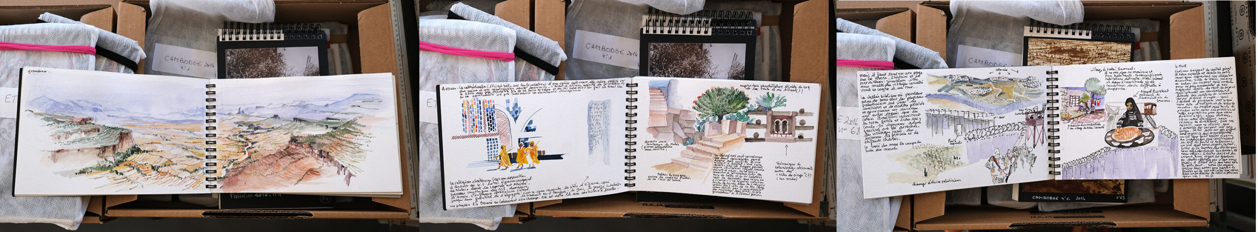 Puis au cours des voyages que j’ai organisé pour des amateurs, des arrêts étaient prévus pour dessiner sur place. Ils correspondent à des traces de passages dans différents pays. Les paysages d’Ethiopie, du Laos, les falaises, les étendues…m’ont fascinée, emportée mais ils n’étaient pas destinés à une utilisation ultérieure… ou peut être de manière inconsciente.