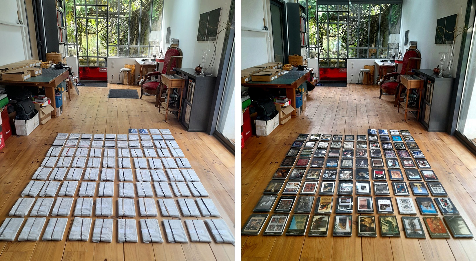 ’ai commencé en 1988 au cours du voyage à New York avec l’association Art 3 ; mon appareil photo ne fonctionnait pas, j’avais du papier et une boîte d’aquarelle. Pour me souvenir de ce voyage, je peignais de mémoire les œuvres vues dans la journée : les grands feutres de Joseph Beuys, les grandes peintures de Barnett Newman ; ou les rencontres dans les ateliers d’Armand, Keith Haring, Bernar Venet… ce fut le début de la série des 82 carnets. Ce travail de mémoire, de traduction de sensations m’est familier.
