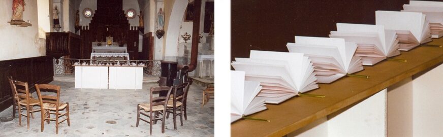 Phenixias était une commande avec le thème des Cendres pour une chapelle encore consacrée. « Le Retour du Phénix de Marthe de Chambrun Ruspoli » (continuité de l’Egypte au christianisme) a été le livre que j’ai recopié avec le rituel du labeur d’un scribe. Les pages cousues une par une sur des voiles de coton de 120 x 200 constituaient des portes par lesquelles ne pouvait passer qu’une personne à la fois. L’écriture du texte, trop petite, ne se lit pas. Il s’agit donc de la non-lecture d’une réécriture reproduite.