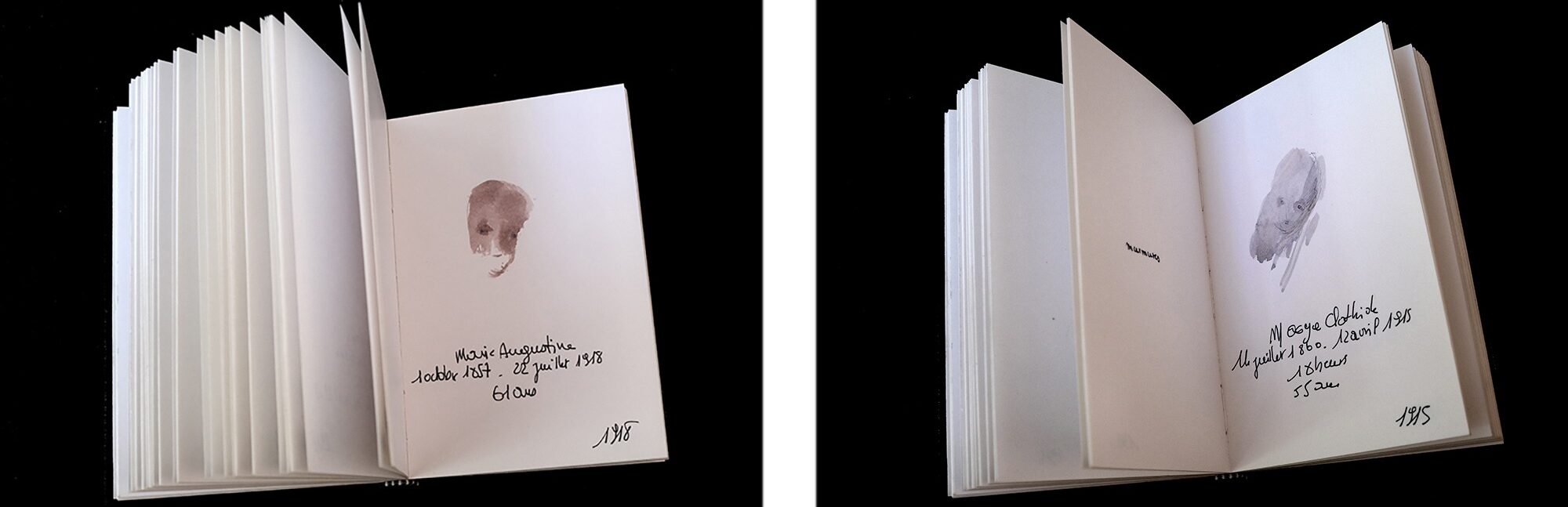 MF – Dans le cadre d’une résidence en 2001, le tracé défigurant du passage de la ligne TGV Paris-Marseille avait fait lever les voix des habitants de la Roche sur Grâne, village perché. Ce qui a suscité le thème d’un travail sur l’Environnement. Certains artistes sont intervenus sur le paysage, j’ai choisi les habitants. Dans notre relation avec la Nature, celle d’hier et celle d’aujourd’hui, il reste des liens avec les traces de ceux qui nous ont précédés, aussi, de ce village, j’ai souhaité évoquer le passage de la vie de ceux qui y ont laissé des traces non visibles, en me référant aux registres d’état civil de la mairie. Je n’ai eu qu’un après-midi pour les consulter et une semaine pour réaliser Murmures. Nous venions de changer de siècle, mon matériau a été la liste des personnes décédées entre 1900 et 1999. Pour le village, ce temps du 20e siècle correspond à 9 carnets comprenant 216 noms. La date de leur mort et la sonorité de leurs prénoms ont été porteurs de 216 portraits. Mettre des visages à ceux qui ont connu les champs, les arbres, la poussière des chemins, c’est dire par une image une présence et une absence. L’œuvre Murmures (ill. 3 à 6) sera montrée le temps d’un WE dans l’église du village, lieu de leur dernier passage. La consultation des registres de la mairie a mis en avant les différentes pratiques d’enregistrements : écriture à la main, encre et plume au début du siècle avec des détails concernant les décès, plus tard à la machine à écrire, puis sur des formulaires. Maintenant le numérique retire toute humanité.