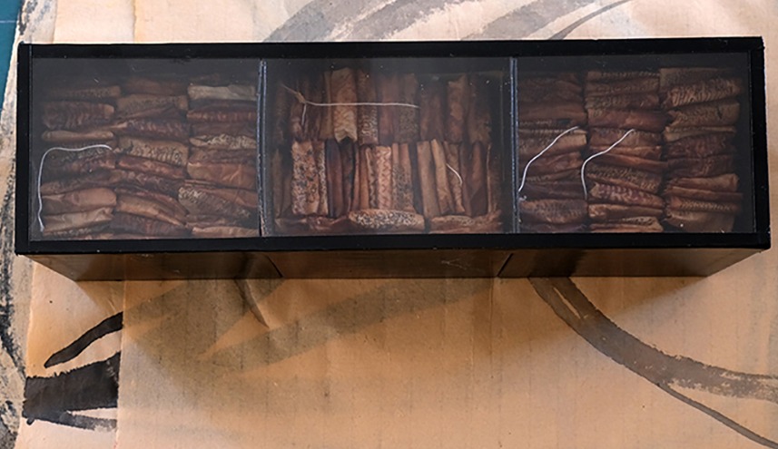 MF – Attentive, non. Si j’ai utilisé pendant longtemps les sachets de thé, c’est avant tout pour un papier particulier. Ce qui m’a séduite, c’est leur utilisation de filtres. Je m’en suis servie pour 500 dessins, des boites Reliquaires (ill. 7), des livres, une grande installation faite de bandes d’écriture Testaments, Les Accompagnants une grande peinture horizontale faite de 4000 sachets peints. Puis, ayant le sentiment d’en avoir une utilisation trop systématique, je m’en suis éloignée.