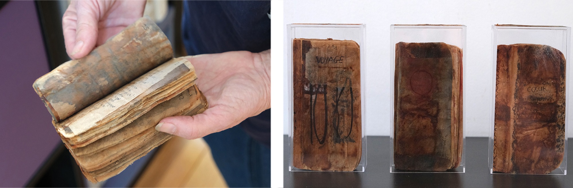 MF – L’Étagère est une série de 8 livres sur des feuilles de sachets de thé, protégés dans des étuis de plexiglas. Les livres composés pour des poèmes réécrits ont parfois des petits dessins. De la série des Reliquaires, L’Étagère est destinée à prendre place dans une bibliothèque. Les poésies choisies comme Le bateau ivre, Le cimetière marin, Voyage, etc. sont l’inspiration confondue des poètes. En résonnance avec les autres reliquaires, ce sont des points d’appui, éphémères pour la mémoire à garder. Le premier livre de la série a été acheté en 2000 par la Médiathèque de Romans.
