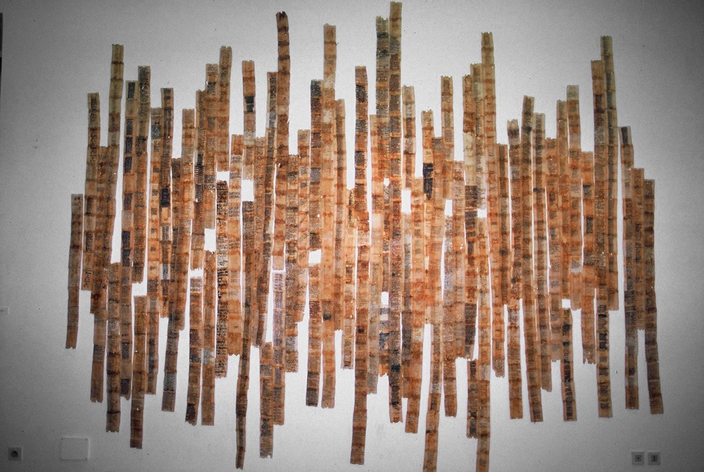 était une commande avec le thème des Cendres pour la chapelle du lycée Montplaisir à Valence. « Le Retour du Phénix de Marthe de Chambrun Ruspoli » (continuité de l’Egypte au christianisme) a été le livre que j’ai recopié avec le rituel du labeur d’un scribe. Les pages cousues une par une sur des voiles de coton de 120 x 200 constituaient des portes par lesquelles ne pouvait passer qu’une personne à la fois. L’écriture du texte, trop petite, ne se lit pas. Il s’agit donc de la non-lecture d’une réécriture reproduite.