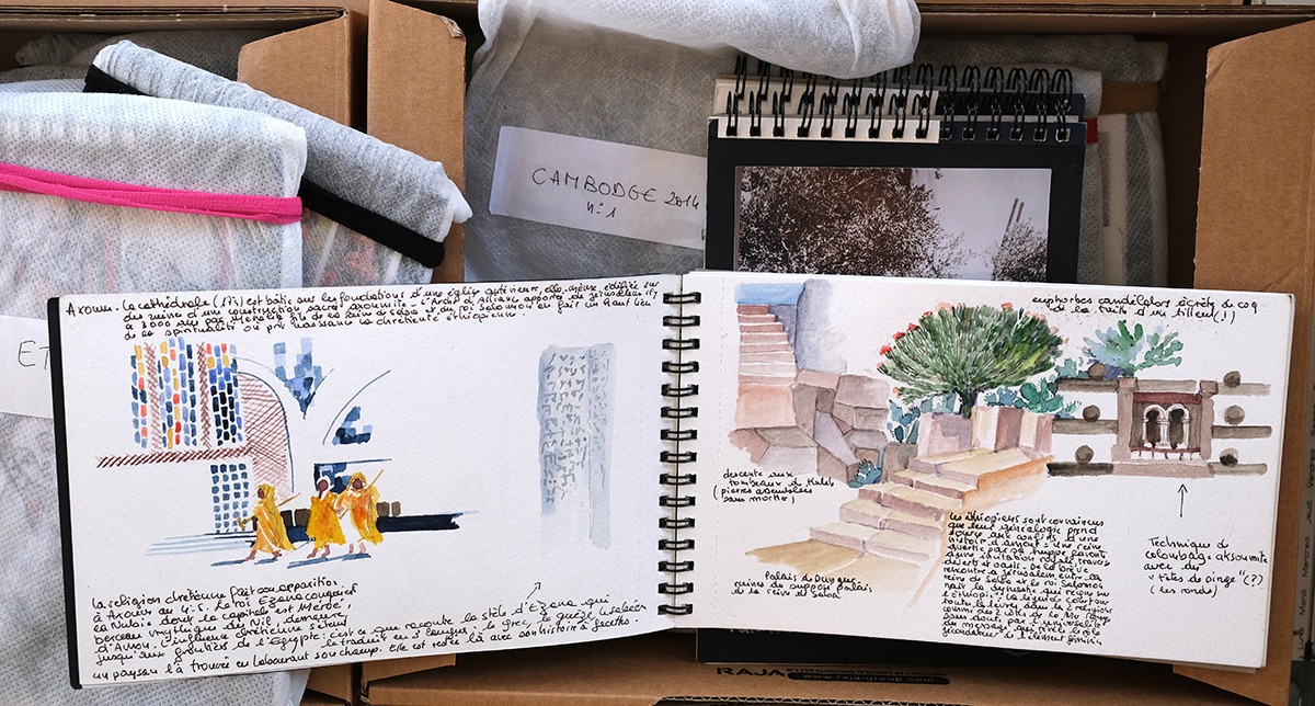 Q+E – Nombreux carnets mêlant aquarelle et annotations ont été réalisés au cours de tes voyages dans le monde entier (Vietnam, Inde, Pérou, Jordanie, Turquie, Iran, Palestine…). Ces croquis et ces annotations, sont-ils faits sur place ? Sont-ils des sources d’inspiration ?