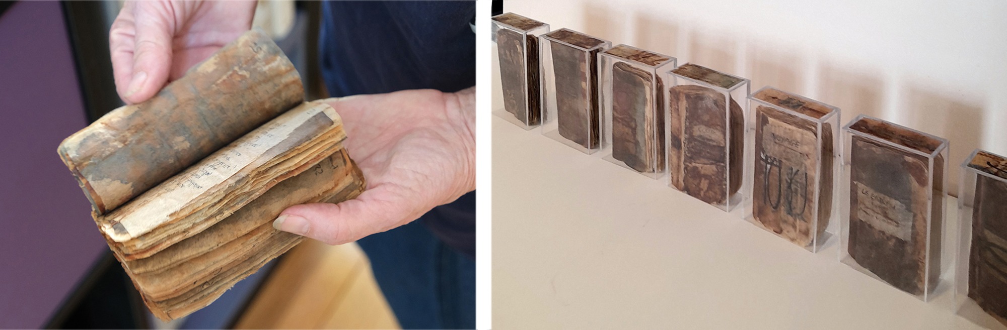 MF – L’Étagère (ill. 8) est une série de 8 livres sur des feuilles de sachets de thé, protégés dans des étuis de plexiglas. Les livres composés pour des poèmes réécrits ont parfois des petits dessins. De la série des Reliquaires, L’Étagère est destinée à prendre place dans une bibliothèque. Les poésies choisies comme « Le Bateau ivre », « Le Cimetière marin », « Voyage », etc. sont l’inspiration confondue des poètes. En résonnance avec les autres reliquaires, ce sont des points d’appui, éphémères pour la mémoire à garder. Le premier livre de la série a été acheté en 2000 par la Médiathèque de Romans.