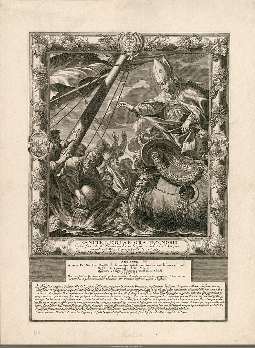1 Jean Couvay (1622-1675 ?), d’après Simon Vouet, Sancte Nicolae ora pro nobis, Confrérie de saint Nicolas fondée en l’église et hôpital de Saint-Jacques à Paris, pour les marchands de vin […], taille-douce. Coll. Bibliothèque de l’INHA, Paris.