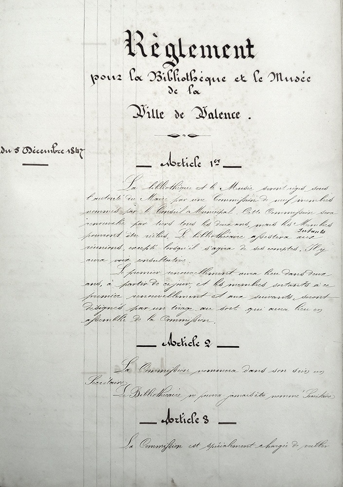 Pendant tout le XIXe siècle et le début du XXe siècle, bibliothèque et musée sont donc dirigés par une commission qui prend toutes les décisions, et gérés par un « bibliothécaire/conservateur » qui ne fait que les exécuter. Le règlement de la première commission, du 15 novembre 1836, la précise : 6 membres nommés par le conseil municipal ; renouvèlement par tiers tous les deux ans ; réunion 4 fois par an en janvier, avril, juillet et octobre. Le conservateur en est le secrétaire. Un nouveau règlement du 15 novembre 1847 (ill. 1) la modifie : 9 membres nommés par le conseil municipal ; réunion le premier dimanche de chaque mois assistée du conservateur ; secrétaire choisi parmi ses membres. Définie comme une commission administrative, elle intervient de fait dans tous les domaines : acquisitions, demandes de dépôts, vérification des comptes…