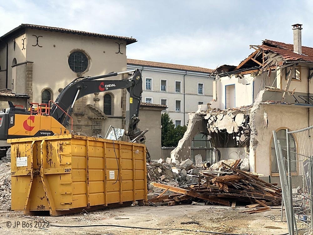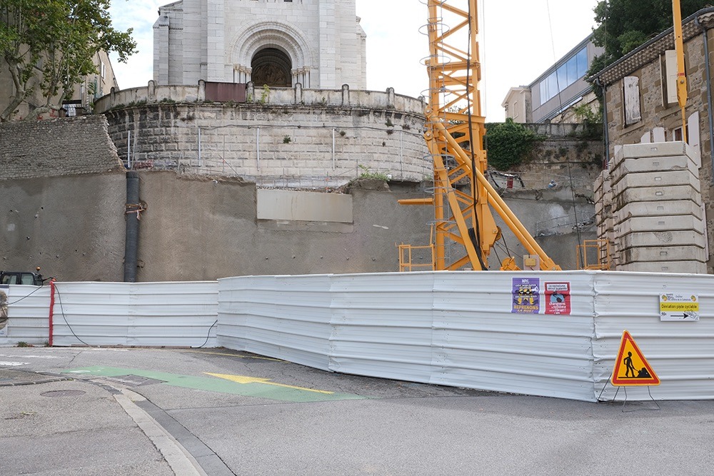- Parvis de la cathédrale et rempart de la cité : dans le cadre du projet de « Cité gourmande » dans la basse ville, sont entrepris des travaux de requalification du parvis (Maître d’ouvrage : État/DRAC) et la construction d’un escalier monumental (Maître d’ouvrage : Ville) sans opération d’archéologie préventive alors que sont présents de nombreux vestiges antiques et médiévaux dont ceux du groupe épiscopal primitif de Valence (Ve siècle), du baptistère paléochrétien, du rempart , de l’église canoniale Saint-Étienne (Xe siècle), etc. Au-delà de la destruction déplorable de vestiges archéologiques, se rajoute la construction d’un escalier monumental pour un montant de 3,2 millions d’€. Conçu à partir d’un croquis réalisé au XIXe siècle par l’architecte Bailly, cet escalier est un véritable pastiche de celui du Parc Jouvet mais inapproprié au site de la basse ville, loin d’une « architecture créative » et hors normes d’accessibilité.