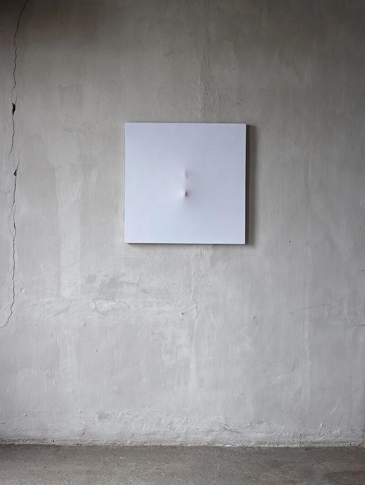 Il m’est resté de mon enfance, passée aux côtés de mon oncle restaurateur de tableaux, la fabrication d’enduits tels qu’on les réalisait au 16e et au 17e siècle : le plâtre « amorphe ». C’est un plâtre raffiné, de qualité, appelé aujourd’hui plâtre de Paris, que l’on « tue » en éliminant toute trace de salpêtre, en rajoutant de l’eau et en le chauffant afin qu’il devienne le plâtre tel qu’on le connaît. Pour un kilo de plâtre, on obtient 25 litres qu’on « rebrasse » tous les jours jusqu’au 28e. Ce dernier jour on écope l’eau, on place ce qui reste de plâtre dans une étamine et on l’étend sur une plaque de marbre. Il se fissure comme un désert. Les morceaux sont broyés pour obtenir une poudre qu’on agglutine avec un medium et qui permet d’obtenir, après ponçage et plusieurs passages, une surface plus lisse et plus froide que le marbre et d’une blancheur absolue grâce au rajout de la poudre de lithopone. J’agrandis ainsi le champ perceptif du tableau. S’y ajoutent tous les codes qu’ont employés mes prédécesseurs : comment agiter une surface abstraite en alternant le passage du pinceau sous forme de croix, en y ajoutant des trames, une sensibilité au bord du tableau, la marge, l’épaisseur du châssis ; comment les conditions d’accrochage interfèrent avec l’architecture ; comment ce châssis donne une dimension objectale différente à la surface recouverte de la peinture.