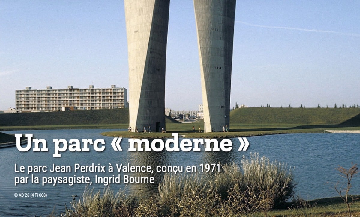 Ecrin pour les célèbres châteaux d’eau du sculpteur Philolaos, le parc Jean Perdrix à Valence fait le lien entre les deux quartiers de Fontbarlettes et du Plan. Aujourd’hui, ce parc s’impose dans la ville par son ampleur et sa modernité. Bien que sa conception s’inscrive dans l’histoire de l’urbanisme et du paysage des Trente Glorieuses, celui des « espaces verts », les paysagistes Ingrid et Michel Bourne, les concepteurs du parc « historique » conçu en 1971 y ont apporté une approche plus sensible au paysage et à l’urbain. Mais c’est Ingrid Bourne, une des premières femmes paysagistes en France qui suivra plus particulièrement les aménagements du parc et ceux de la ZUP de Valence-le-Haut créée en 1963.