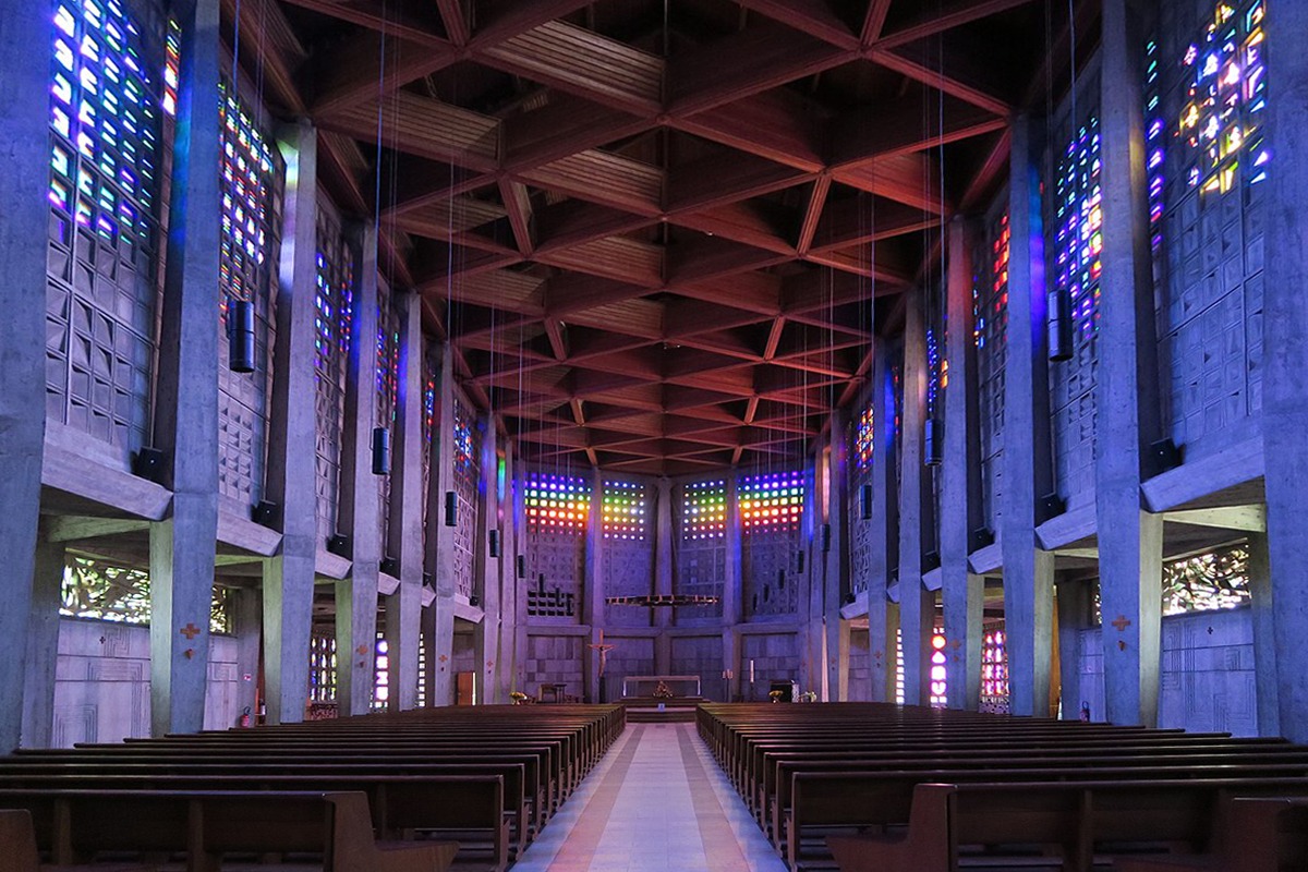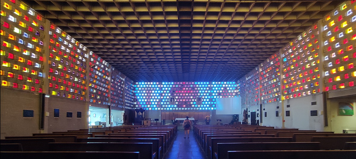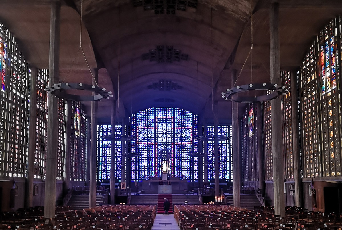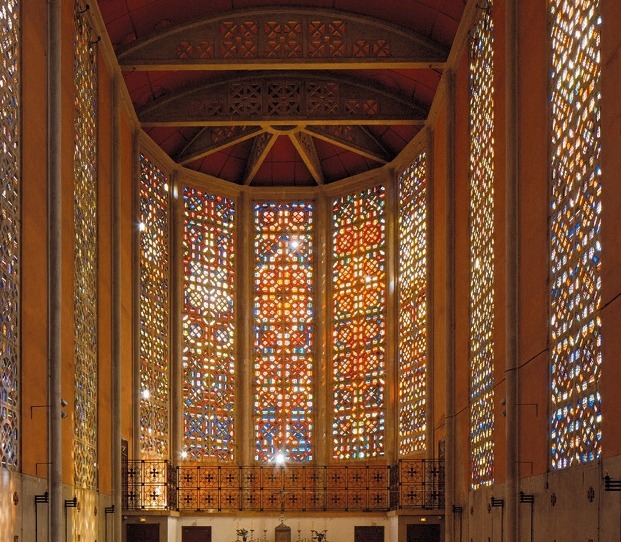 La période de la Reconstruction a particulièrement favorisé l’édification de nouveaux lieux de culte associant béton et dalles de verre coloré.