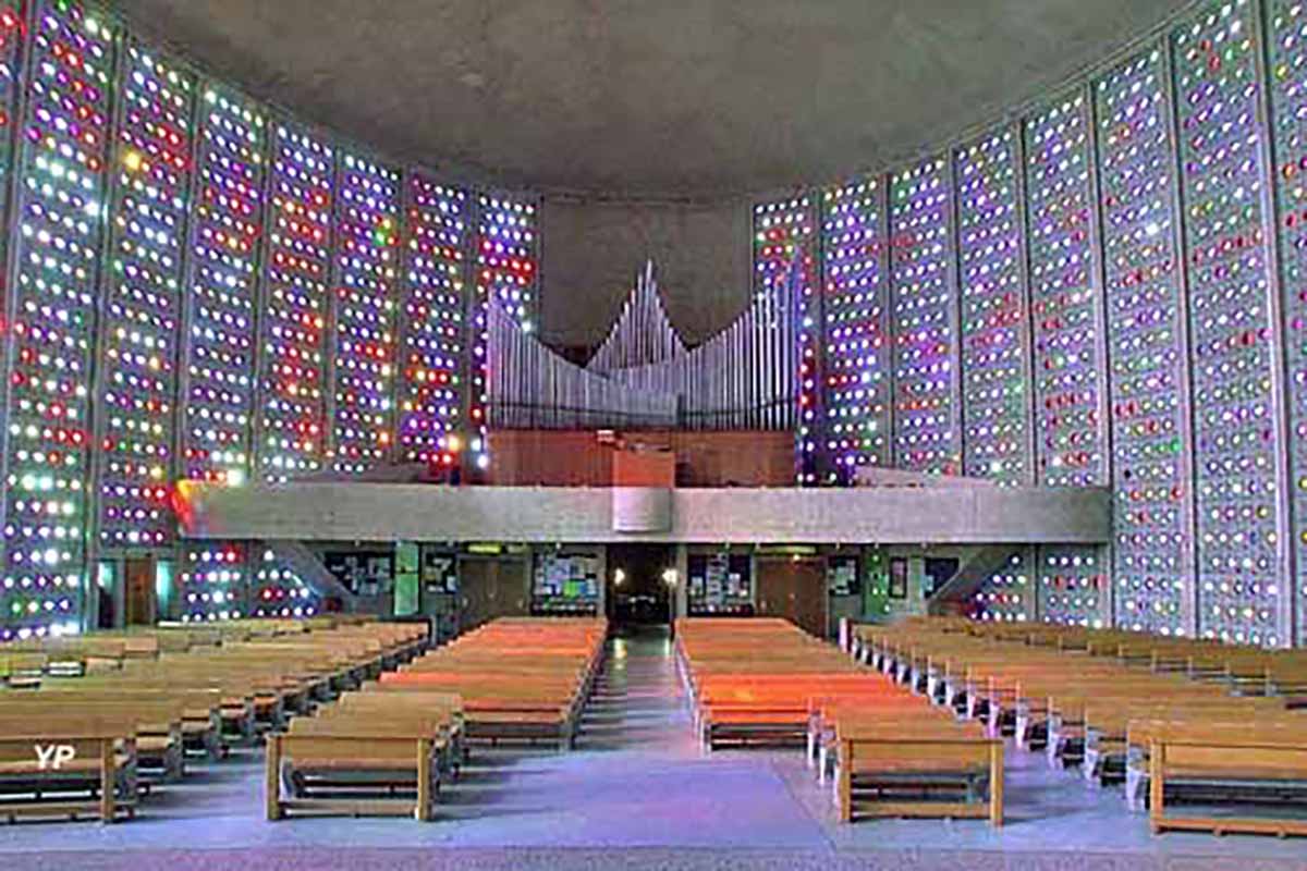 Construite sur un plan elliptique, l’église associe voiles de béton et 4500 dalles de verre coloré dues au peintre-verrier Jean Edelmann.