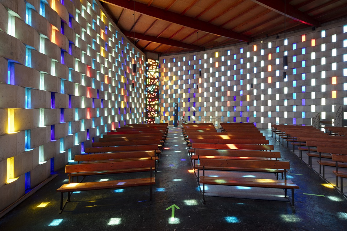 Une résille formée par « une alternance de poutres horizontales et de parpaings de béton posés en boutisse » et de 1860 dalles de verre coloré « en cul de bouteille » offre une lumière vibrante et colorée. (LIEN 6)